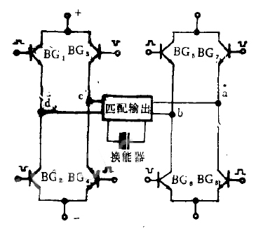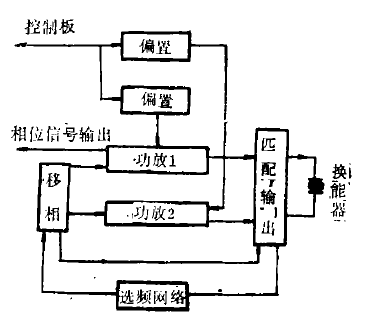 當(dāng)啟動(dòng)信號(hào)經(jīng)控制電路送到偏置電路時(shí), 二組偏置分別加到功放1的、BG1,BG4,和功放2的BG5、BG8, , 然后由輸出產(chǎn)生正反饋信號(hào)通過(guò)選頻網(wǎng)絡(luò)到移相器, 經(jīng)移相后又激發(fā)功放1的BG2、BG3和功放2的BG6,BG7。由于對(duì)電路相位的正確分配, 使二組橋式功放的功率管處于開(kāi)關(guān)狀態(tài)來(lái)建立振蕩過(guò)程, 并達(dá)到功率輸出目的, 二組功放管的輸出均為方波形式, 而經(jīng)過(guò)匹配網(wǎng)絡(luò)后加到換能器時(shí), 由于負(fù)載特性因素, 使換能器二端成為正弦波。該電路的振蕩頻率是由換能器和選頻網(wǎng)絡(luò)決定的, 選頻網(wǎng)絡(luò)可根據(jù)不同換能器頻率進(jìn)行調(diào)整, 使網(wǎng)絡(luò)諧振頻率和換能器諧振頻率取得一致, 達(dá)到最佳匹配效果。